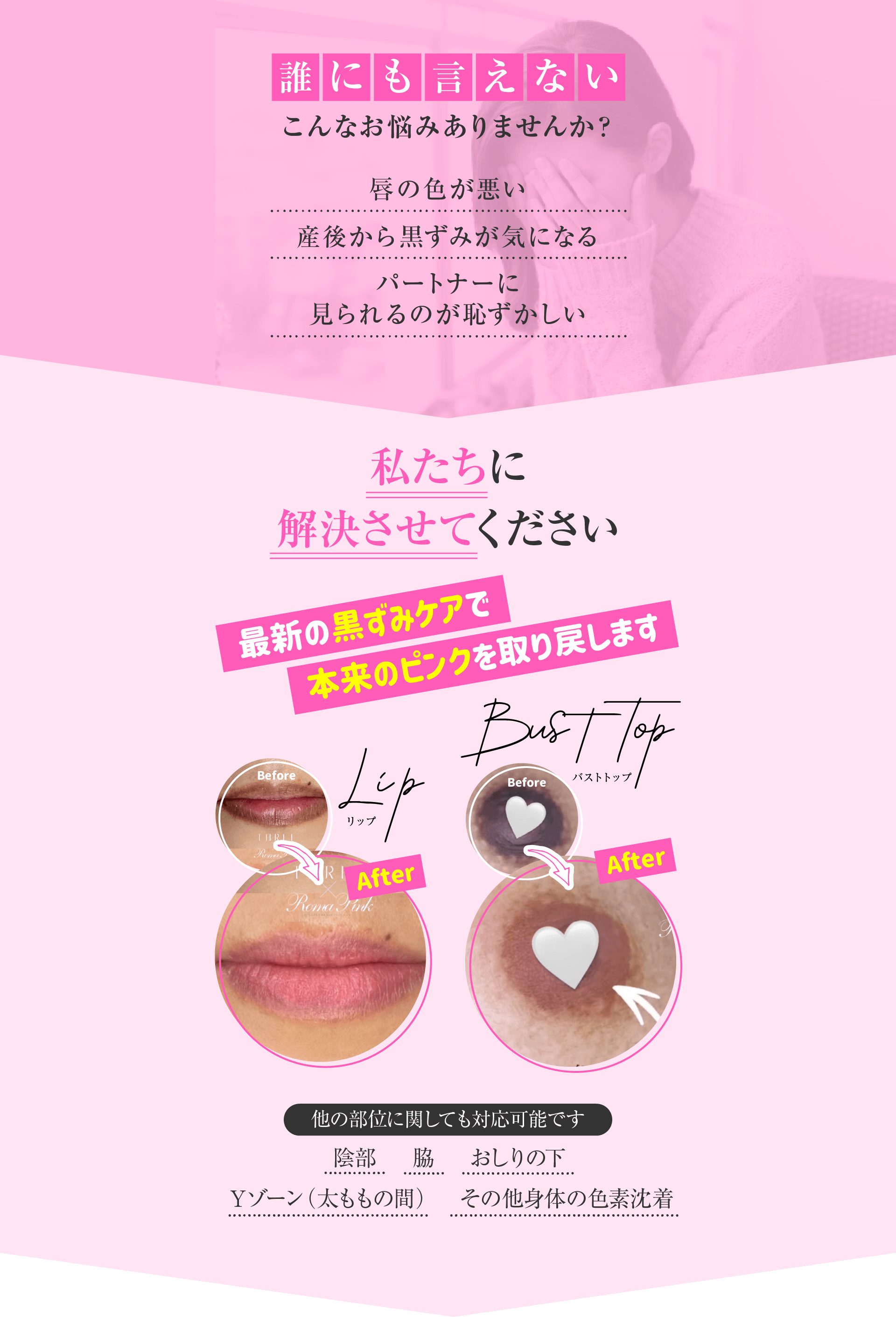 主に「唇」「デリケートゾーン」「乳首」「脇」など、黒ずみが気になる部分に対応可能です。